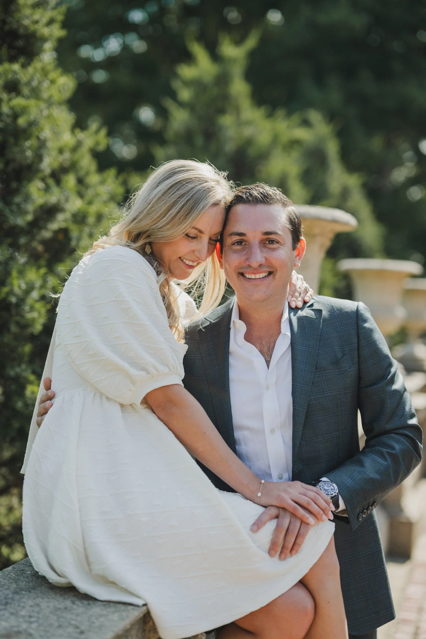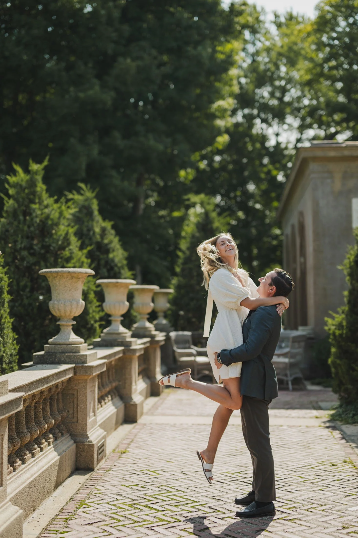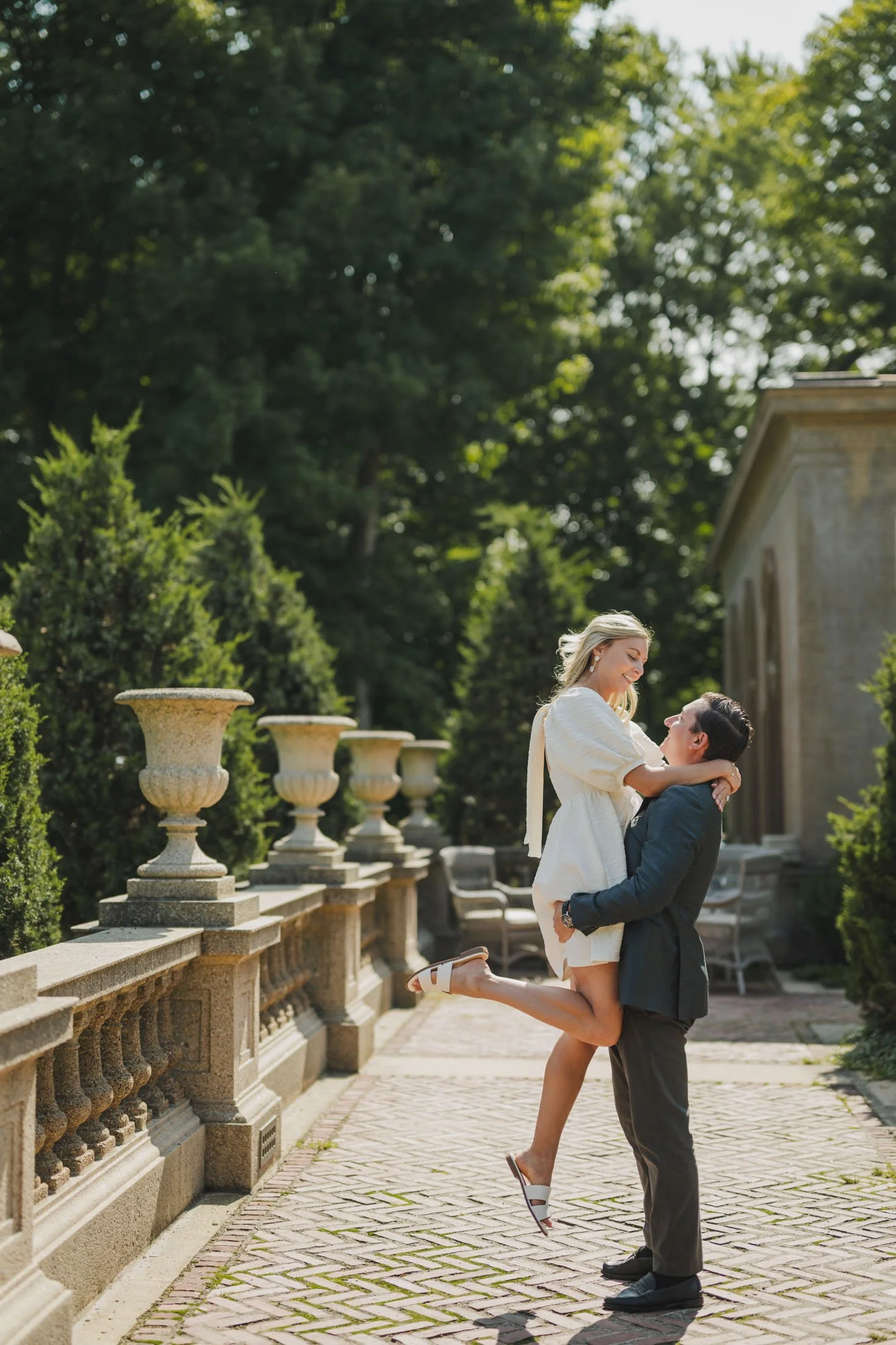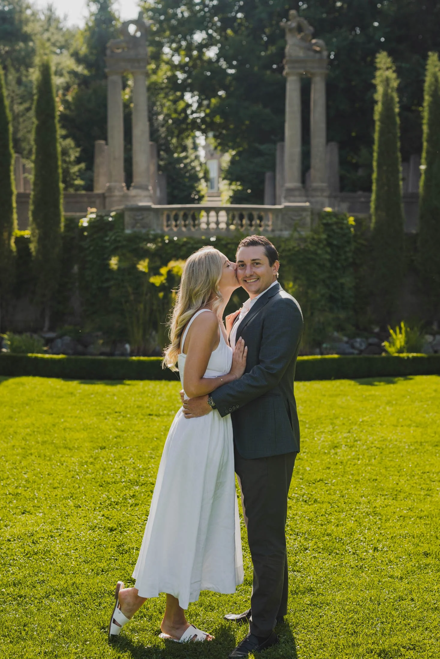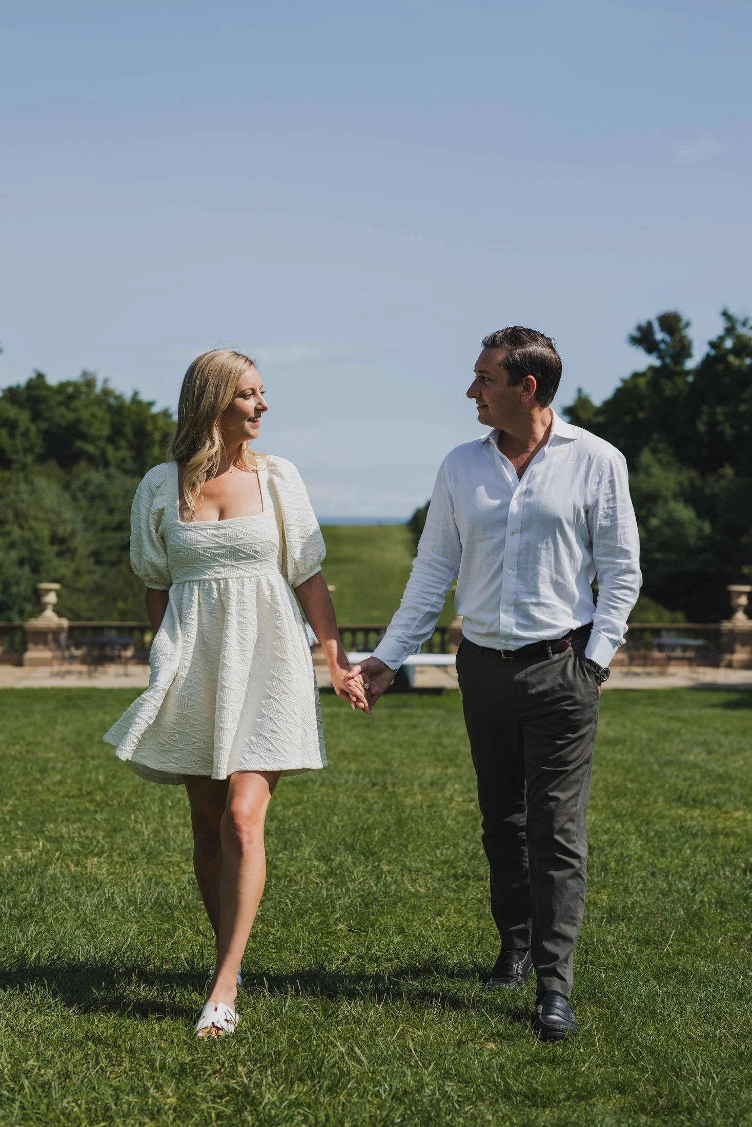 To book your engagement session at Crane Estate, you’ll need a photography permit. The fee goes toward maintaining this stunning historic property (so worth it). With that, you get access to the gardens, grand staircases, and rolling landscapes that make this place so magical. Pro tip: weekday mornings are ideal for fewer crowds and that perfect golden glow like we got for L + D.