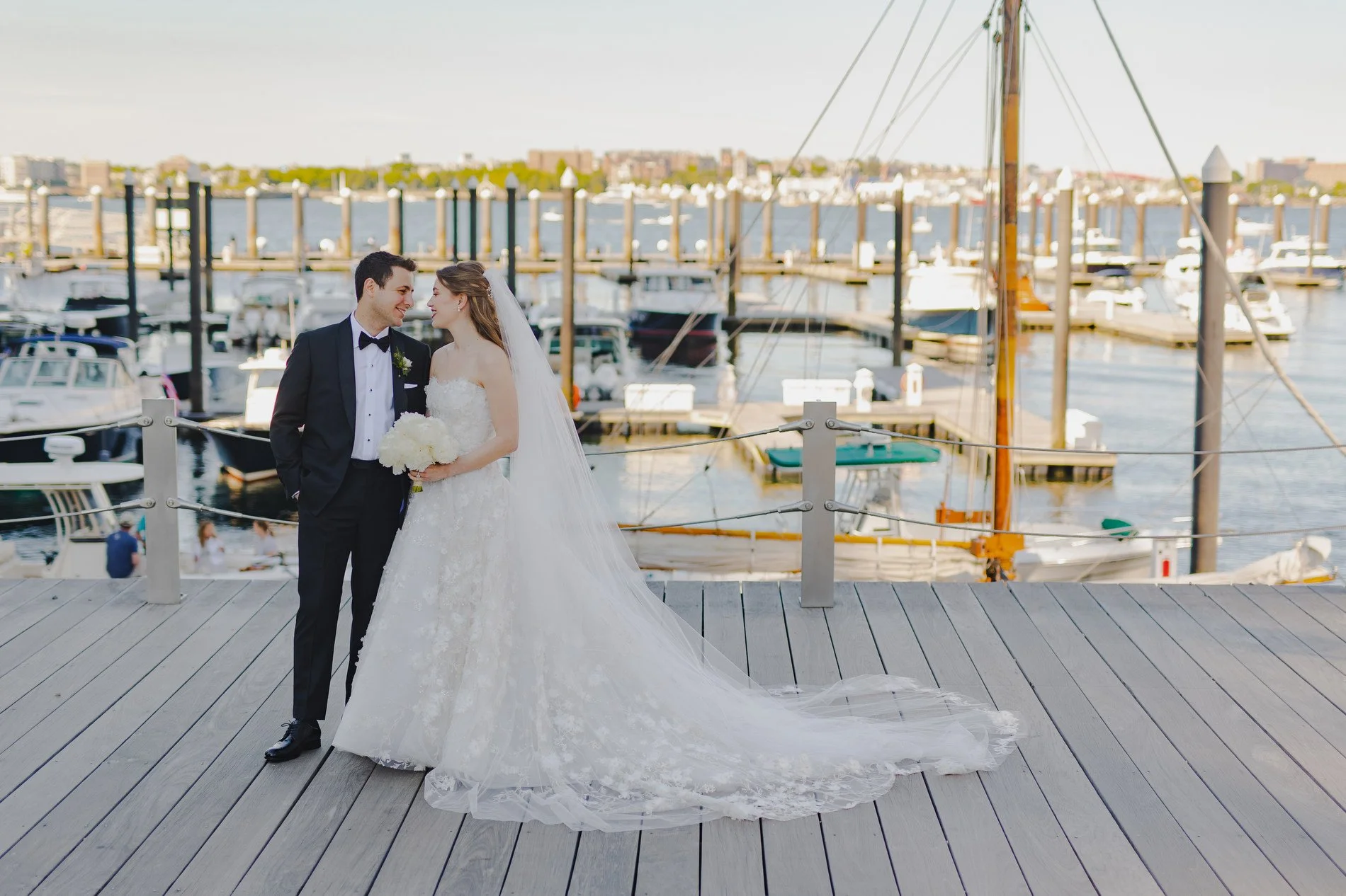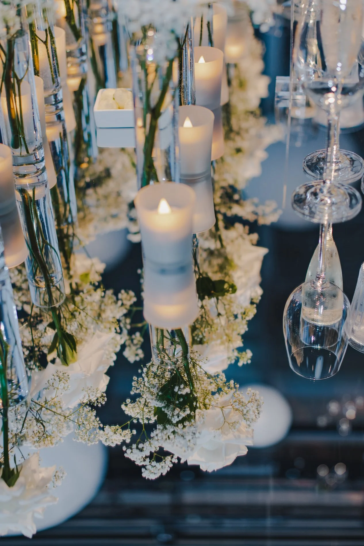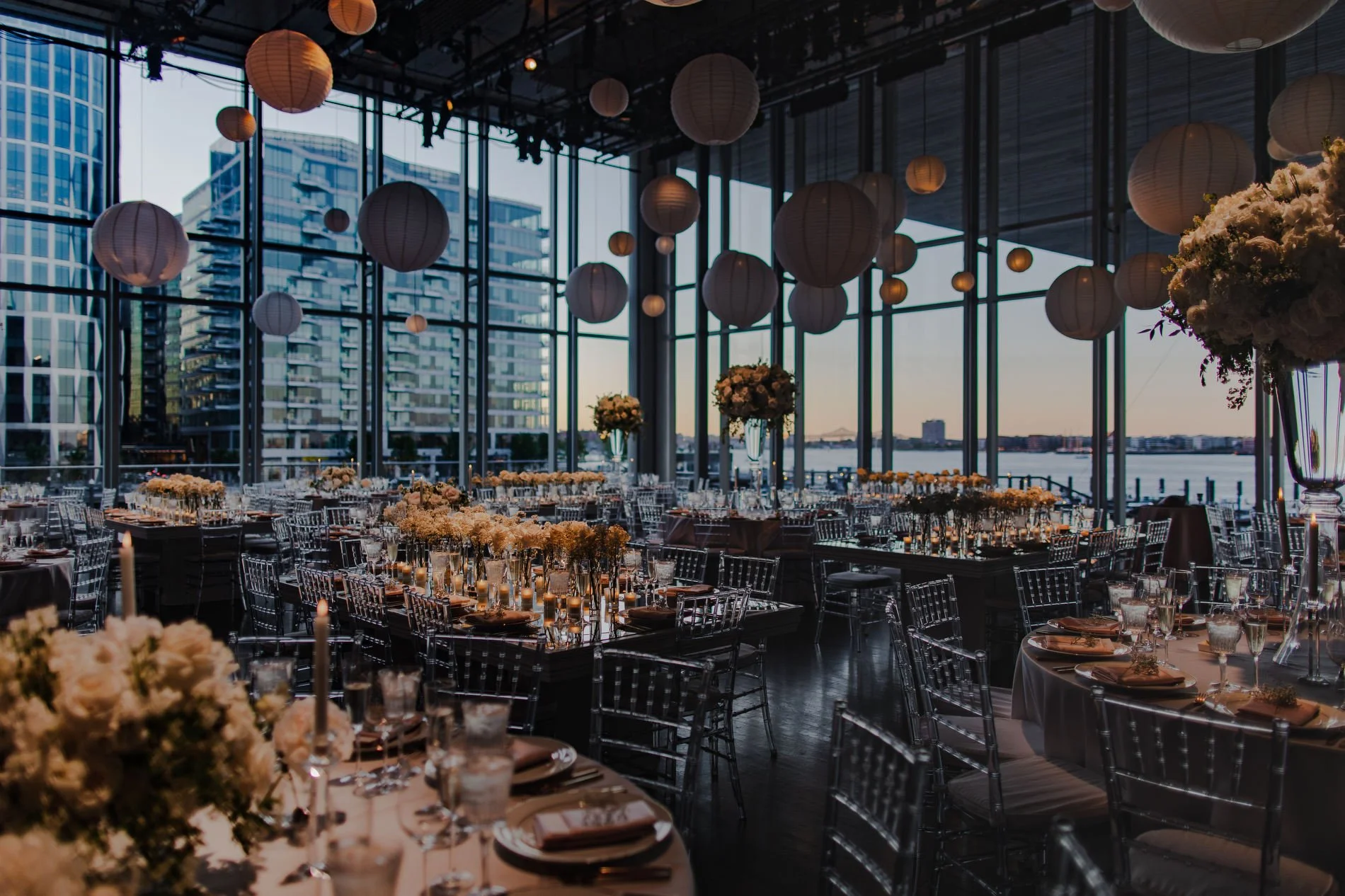 Their reception space overlooking the harbor was designed using long mirror tables covered with white roses, white baby’s breath and white candles. The ceiling was covered with paper lanterns that had lights shining on them. The result was a dancing celestial display of shadow and light on the far wall The design’s elegance was balance by an ethereal playfulness that we fell in love with.