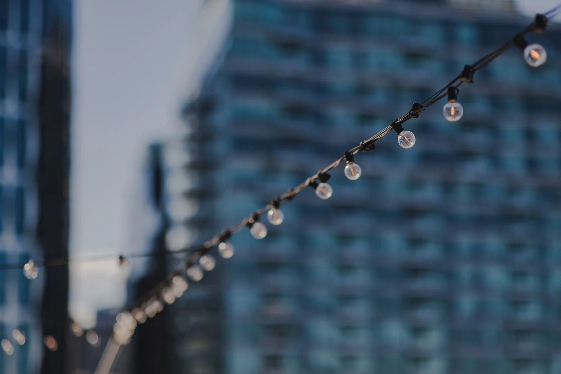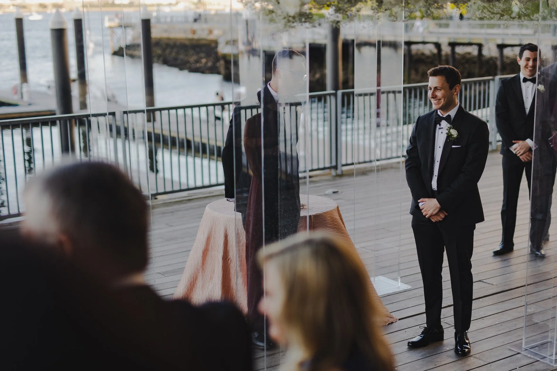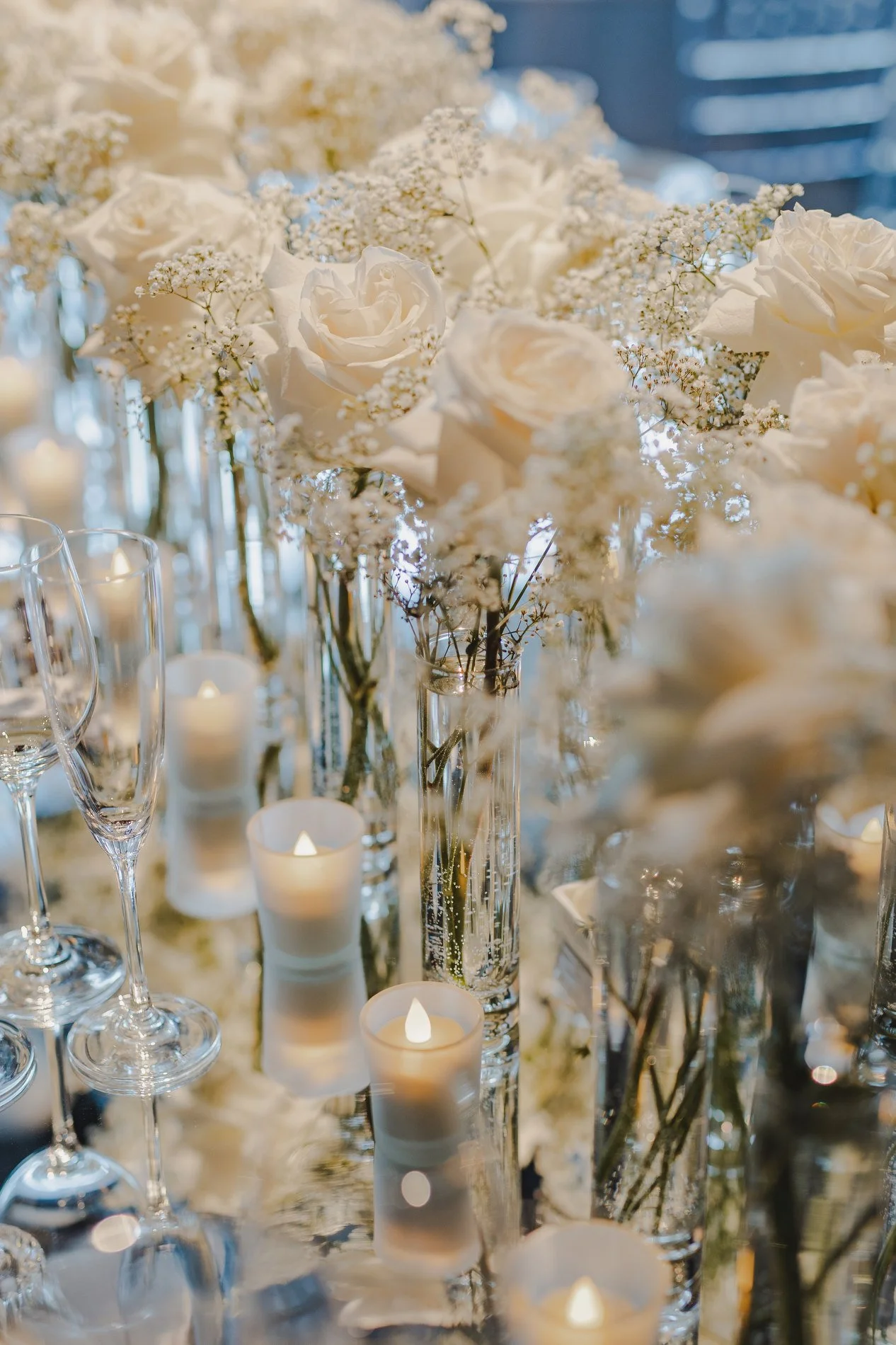 Their reception space overlooking the harbor was designed using long mirror tables covered with white roses, white baby’s breath and white candles. The ceiling was covered with paper lanterns that had lights shining on them. The result was a dancing celestial display of shadow and light on the far wall The design’s elegance was balance by an ethereal playfulness that we fell in love with.