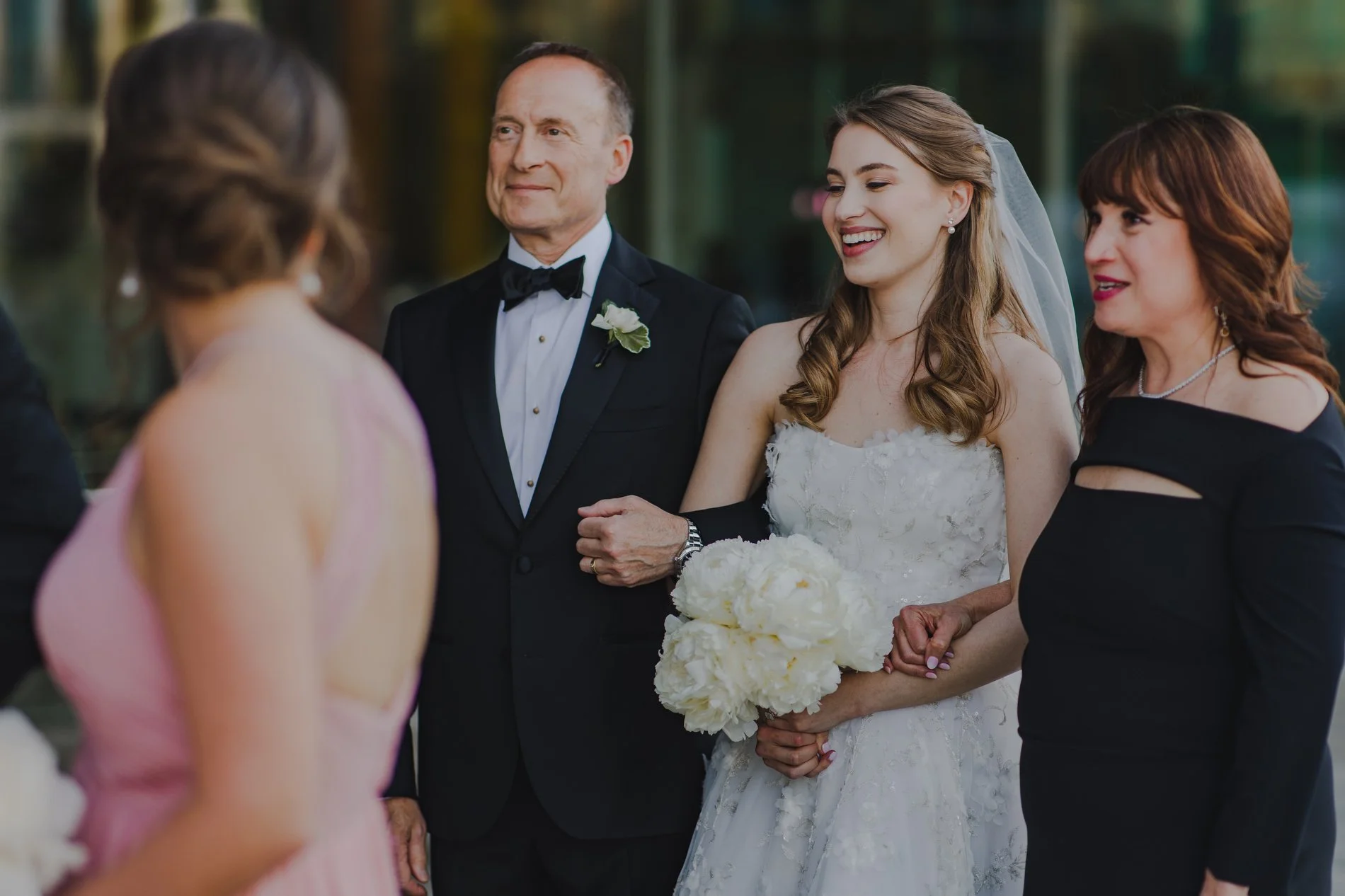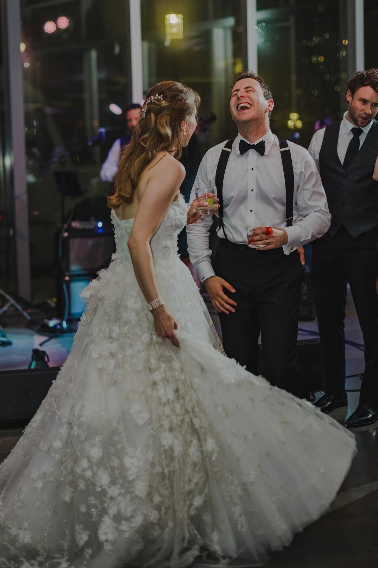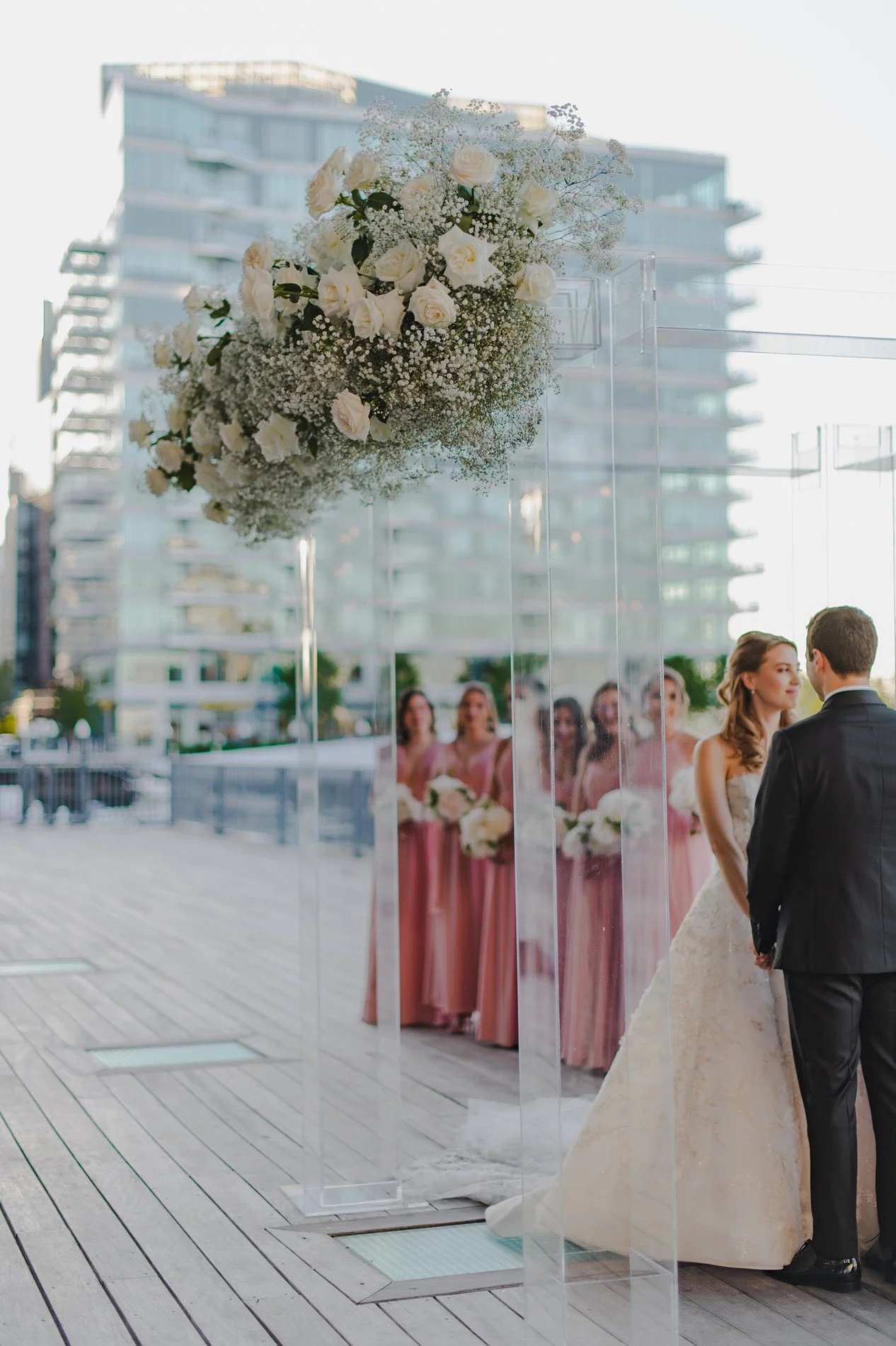 And when I say beautiful, I mean beautiful! A blush and white color palette, classic for weddings, when paired with a modern design aesthetic was elevated and at times otherworldly. Corinne’s bouquet was made of white peonies and her clear acrylic chuppah was topped with so much baby’s breath it looked like clouds floating in the sky above the couple as they read their vows and exchanged rings. Table and Tulip really outdid themselves with this one!