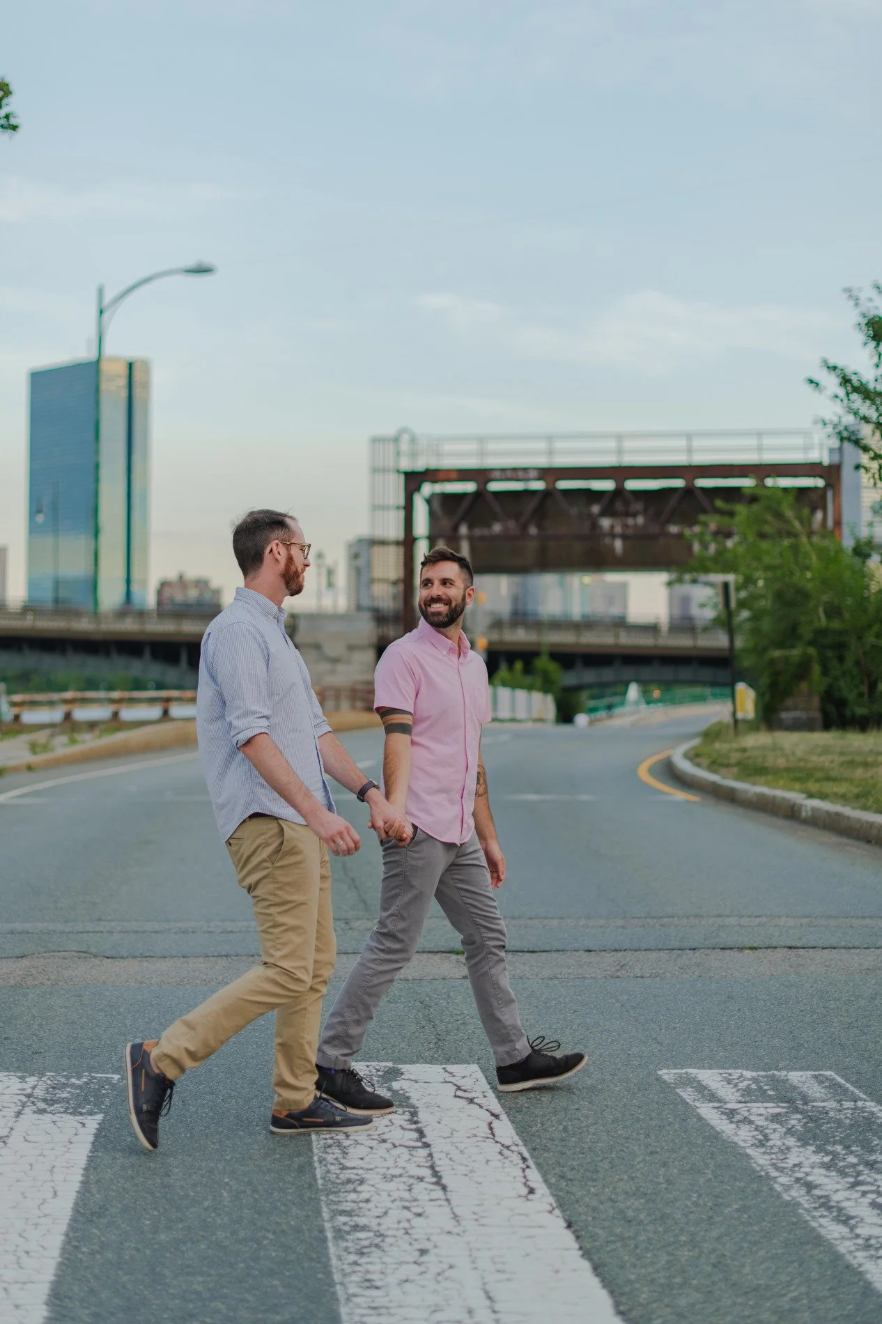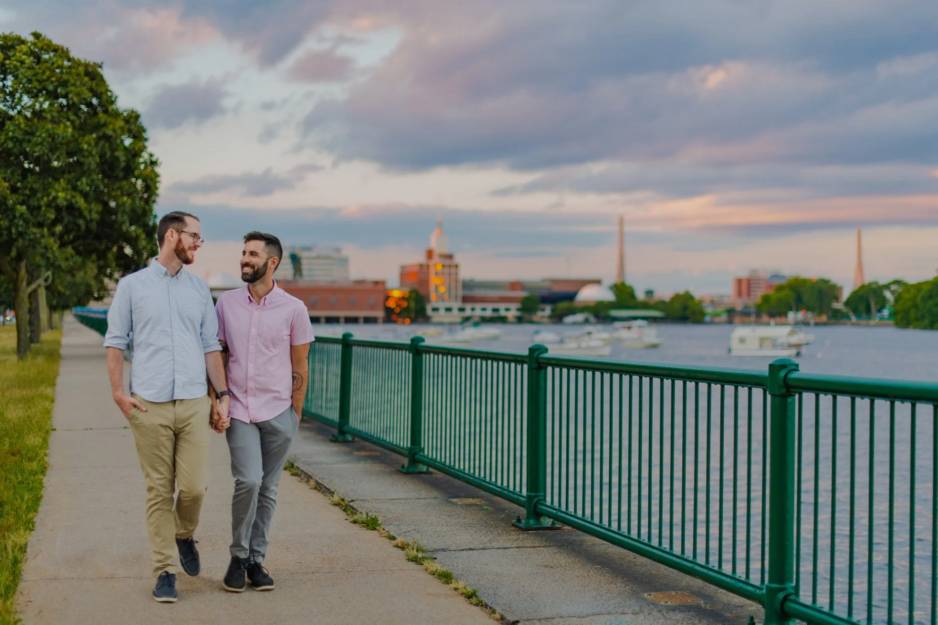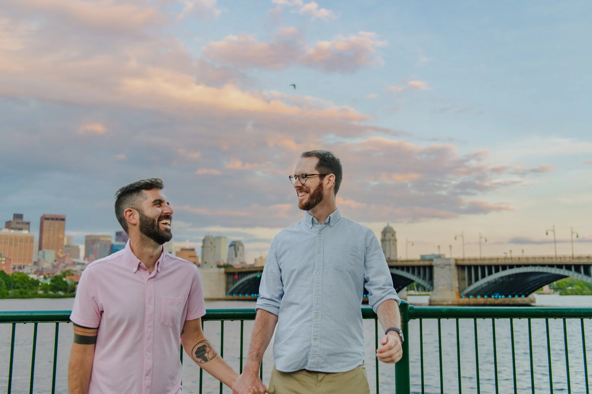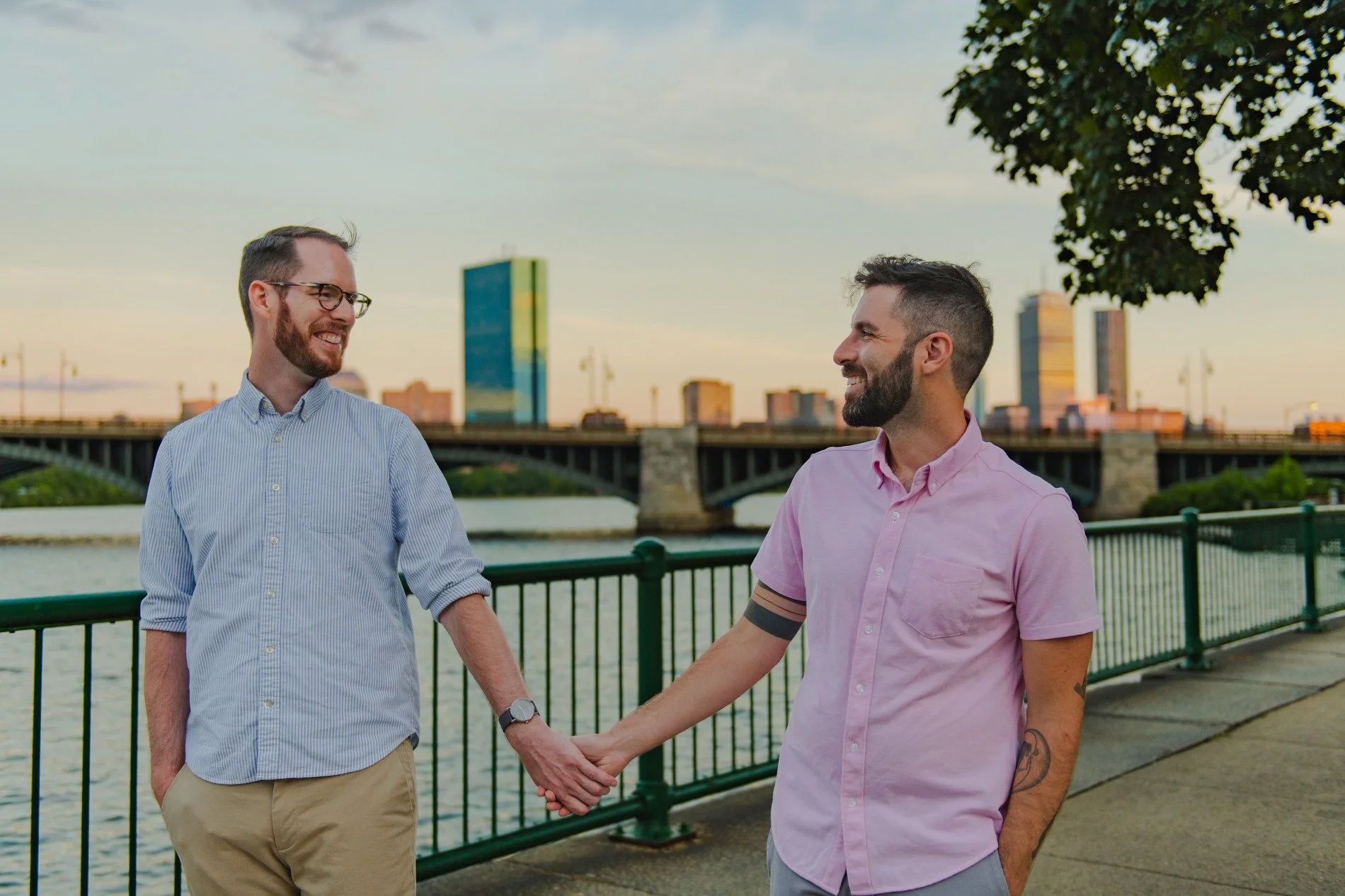 We then headed to the pair’s apartment for a quick outfit change and some stoop photos before heading out to our last location - the Cambridge Canalwalk! This is a hidden gem, in my opinion. It’s right by a number of yummy restaurants, a few blocks from the Kendall Square MBTA Stop, and boasts stunning views of Boston beyond the Charles River. We got there right as the sun began to set, peak golden hour, and it was a truly magical way to end their session.