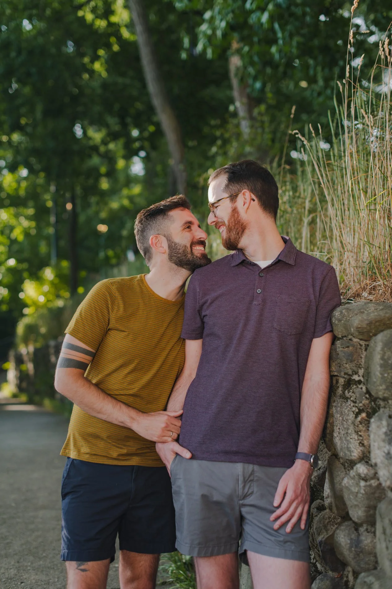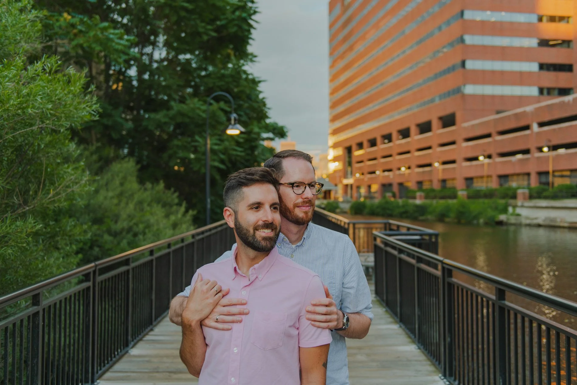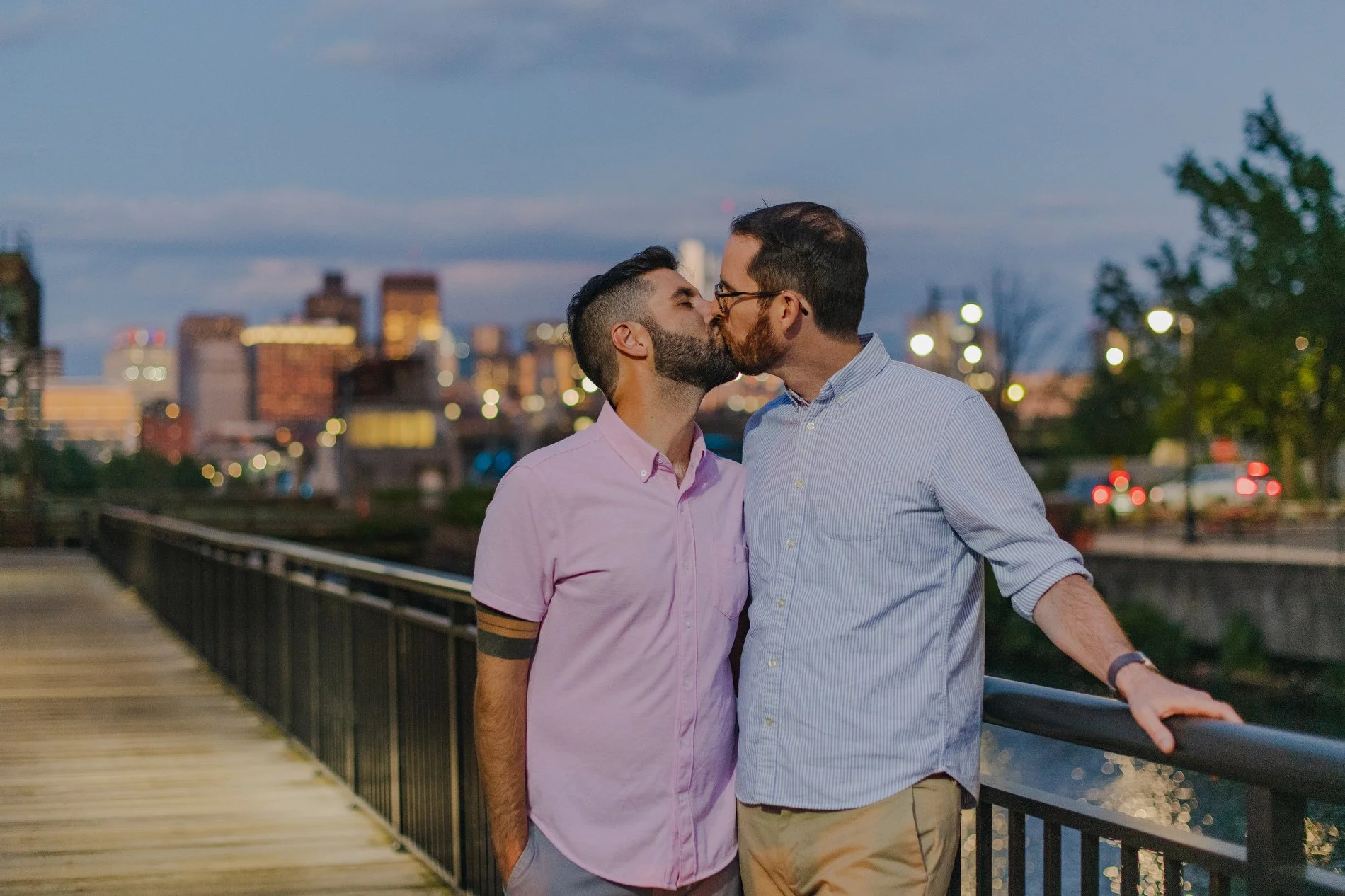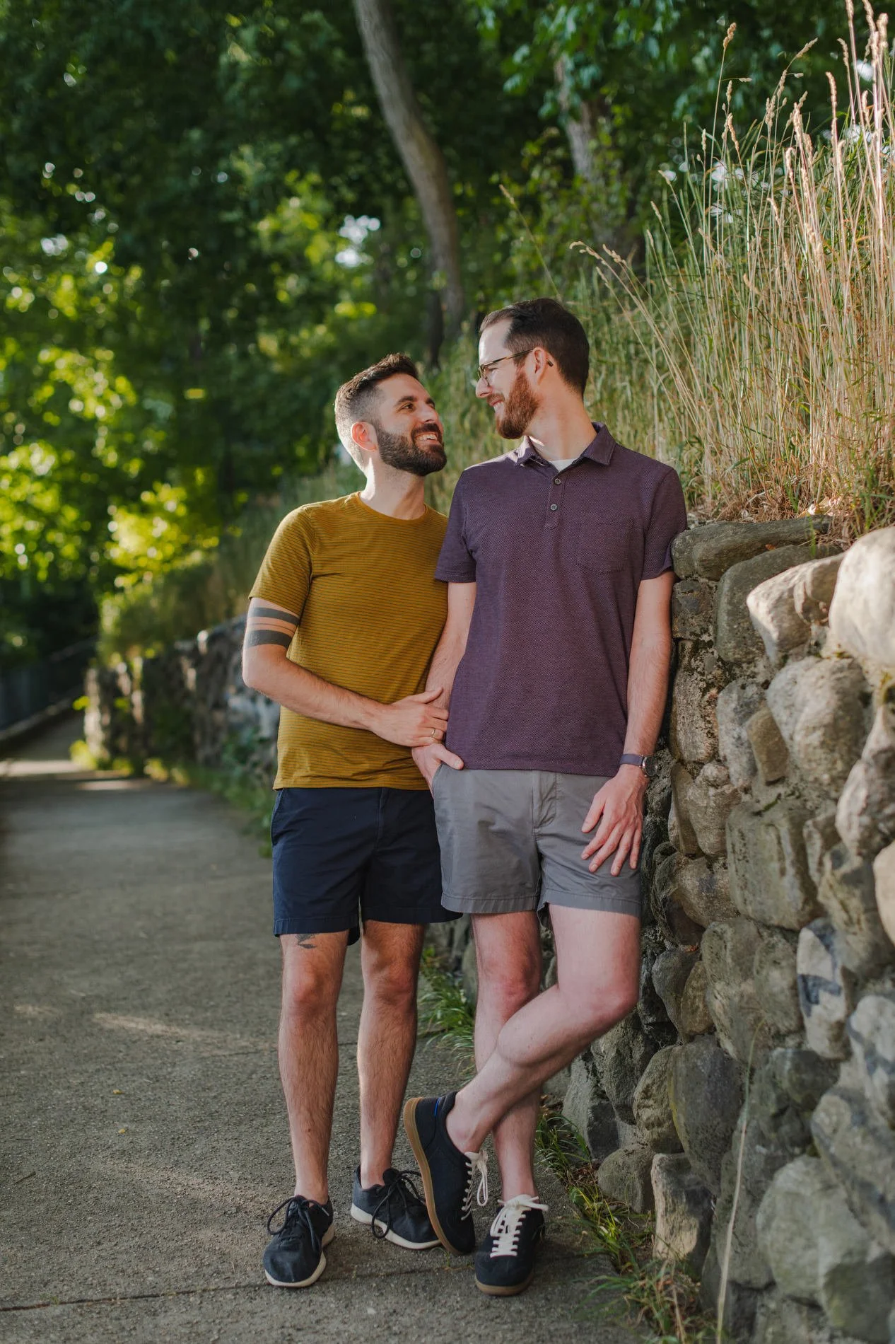 We then headed to the pair’s apartment for a quick outfit change and some stoop photos before heading out to our last location - the Cambridge Canalwalk! This is a hidden gem, in my opinion. It’s right by a number of yummy restaurants, a few blocks from the Kendall Square MBTA Stop, and boasts stunning views of Boston beyond the Charles River. We got there right as the sun began to set, peak golden hour, and it was a truly magical way to end their session.